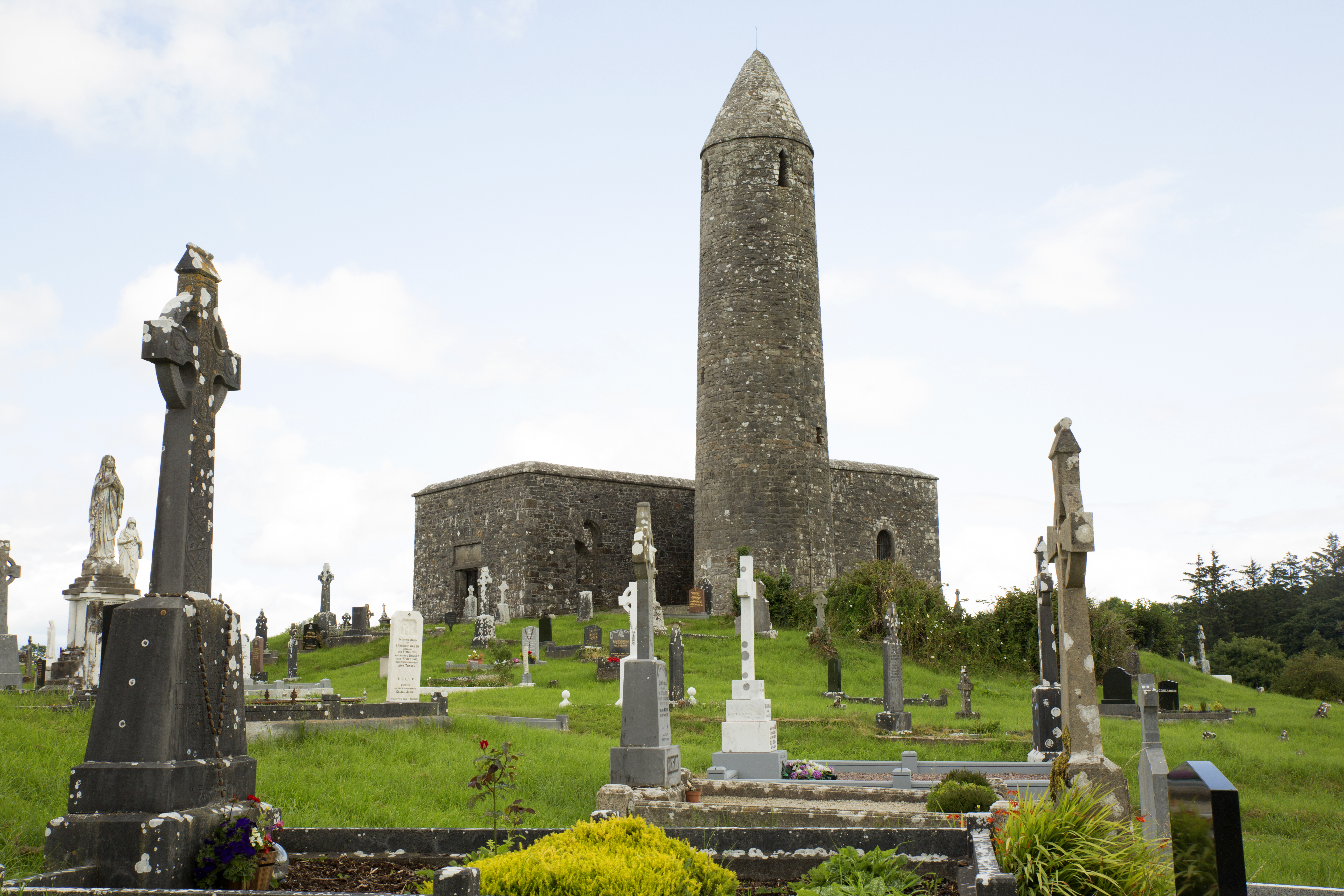 Turlough is another tiny village in between Parke and Castlebar. It is home to Turlough Round Tower, an impressive structure from between 900 and 1200. A plaque in front said it was founded by St. Patrick, who baptized many people at a nearby well. Many structures across Ireland make a similar claim. There is a cemetery attached to it, where I have more relatives buried, including my second great-grandparents.